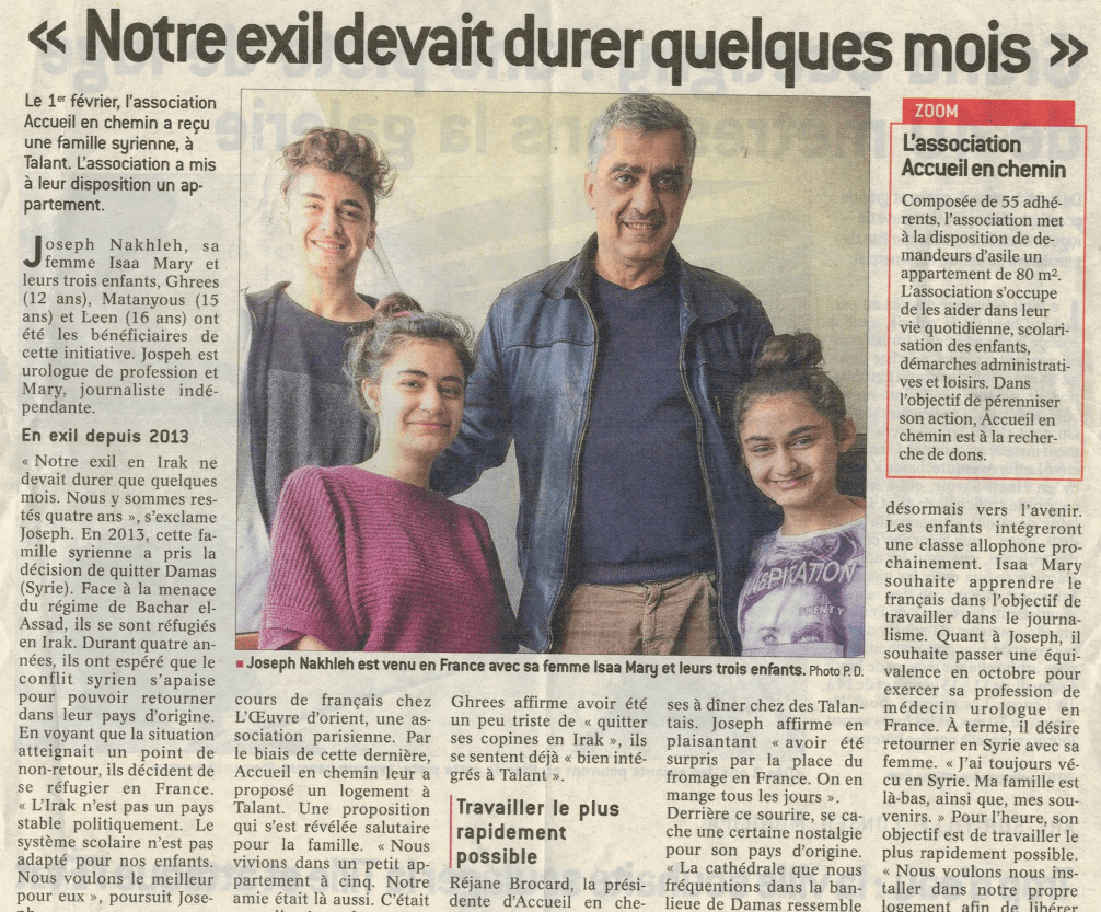 Un mois après son premier article sur notre association, le Bien Public a de nouveau couvert nos activités. Cet article, publié le 18 février 2018 permet aux lecteurs de rencontrer la première famille accueillie à Talant par Accueil en Chemin : les Nakhleh.