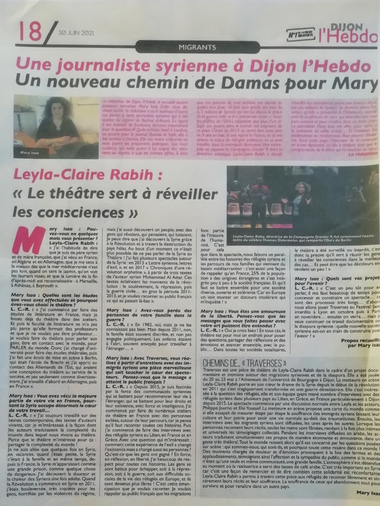 Ces quelques semaines passées à la rédaction de Dijon l’Hebdo ont donné à Mary Isa l’opportunité d’exercer à nouveau son métier, en allant à la rencontre de Leyla-Claire Raby. En lisant l’interview de Mary, nous découvrons l’ambitieux projet de la metteuse en scène : réunir la parole d’immigrés syriens pour la partager à travers une pièce : Traverses. Le projet de Leyla-Claire Raby, d’origine syrienne, fait écho à l’expérience de Mary Isaa.